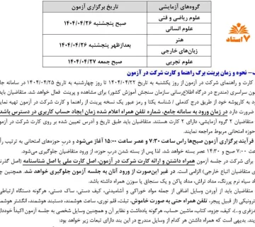 اطلاعیه درباره برگزاری آزمون سراسری ۱۴۰۴ و اصلاح کارت ورود به جلسه7 استادتیر 23, 1404آزمون سراسری سال ۱۴۰۴ در روزهای ۲۶ و ۲۷ تیرماه برگزار خواهد شد. رئیس سازمان سنجش ... ادامه مطلب