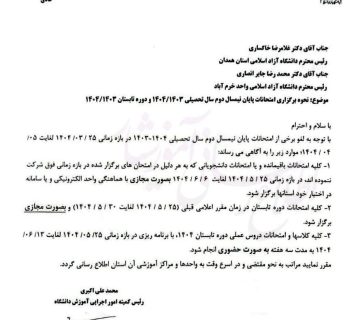اطلاعیه مهم درباره نحوه برگزاری امتحانات باقیمانده ترم بهمن و تابستان ۱۴۰۴7 استادتیر 31, 1404با توجه به لغو برخی از امتحانات پایانترم نیمسال دوم تحصیلی ۱۴۰۳-۱۴۰۴ در بازه ۲۵ خرداد ... ادامه مطلب
