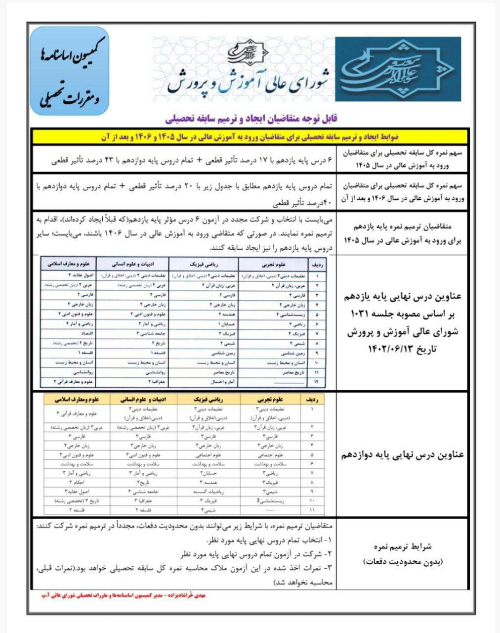 - برای اعمال تأثیر، ملاک آخرین نمرات و تراز بهدستآمده در ترمیم است.